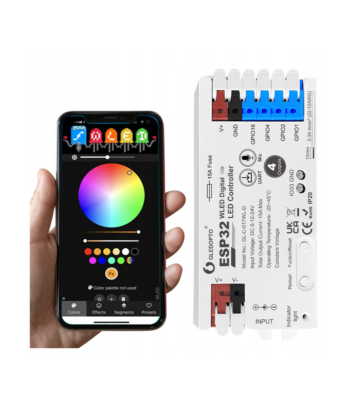 Sterownik oparty na module WiFi ESP32 pozwala na łatwe programowanie i kontrolę za pomocą aplikacji WLED na telefonie, przeglądarki internetowej lub systemu Home Assistant. Idealny do projektów DIY, dekoracji i profesjonalnych instalacji oświetleniowych!